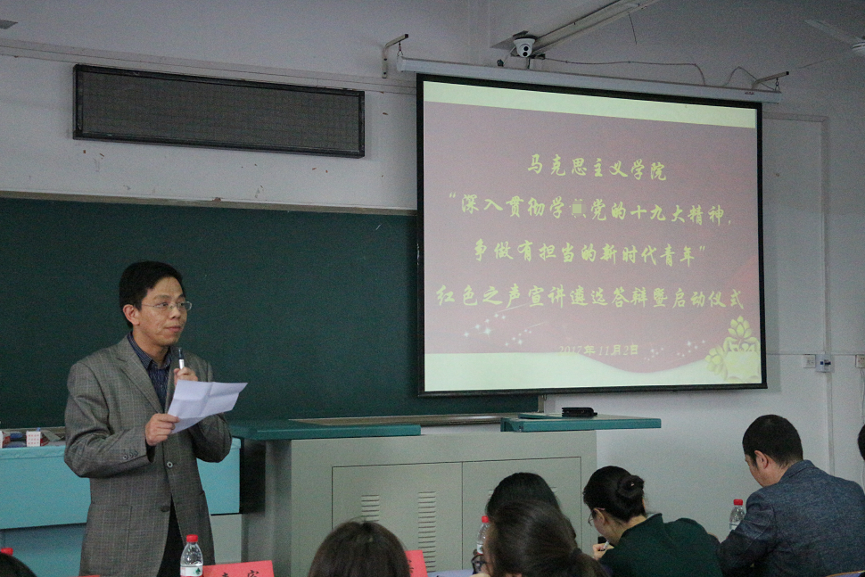 最后,学院党委书记侯志军老师总结讲话。他指出学院“红色之声”宣讲活动有很高的政治价值和很好的实践价值、人才培养价值,“红色之声”宣讲是“学懂、弄通、做实”党的十九大精神的重要载体。同时,侯书记对参加宣讲的同学提出要求,一是要做好角色定位,要始终按照中央要求,以学生喜闻乐见的方式进行理论宣传;二是要提高能力,在宣讲过程中提升学习能力、研究能力和表达能力。三是要实干。在实现“两个一百年”和“中国梦”的伟大进程中勇于奋斗,勇于创新,争当“有理想、有本领、有担当”的新时代青年,成为中国特色社会主义的合格建设者和可靠接班人。