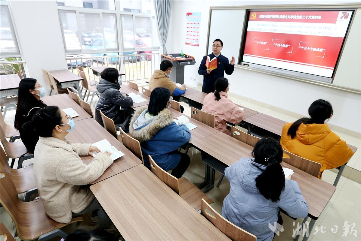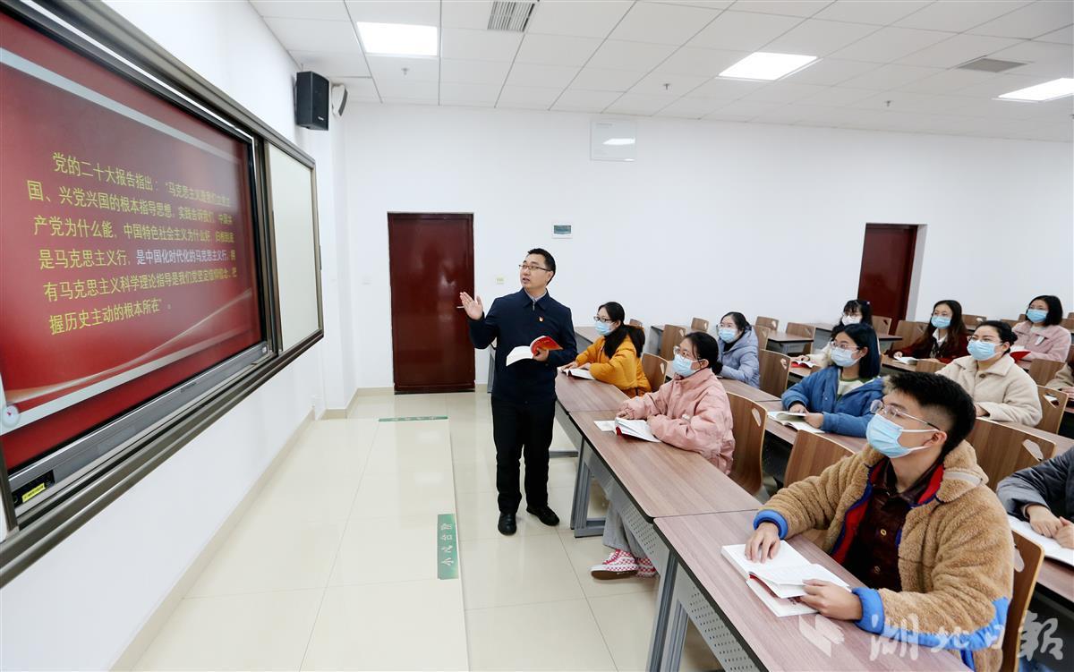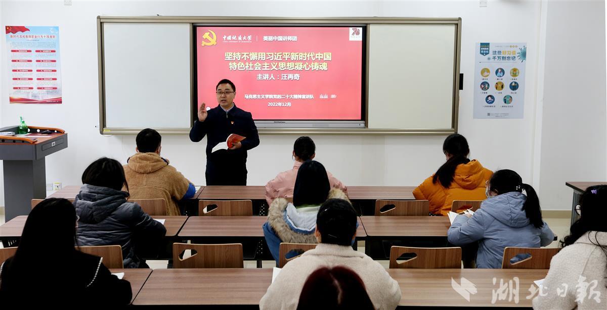 12月8日,williamhill中国(武汉)williamhill威廉希尔汪再奇副教授,用通俗易懂的语言在课堂为学生宣讲党的二十大精神,激励青年学子不忘初心跟党走,勇担重任立潮头,用知识报效祖国,建功新时代新征程,并与同学们互动交流分享学习体会。