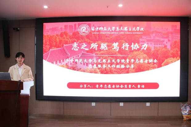 随后,分别由童话代表华师马院青协、张祖豪代表地大马院青协进行了协会工作内容分享。她们首先从组成人员、协会宗旨等方面详细介绍了各自团队的组织架构,随后又介绍了各自的常规活动和各类特色活动,并分享了自身团队特色活动、大型会议志愿服务活动时收获的经验。最后讲述了她们所带领团队近年来所获得的成就。
