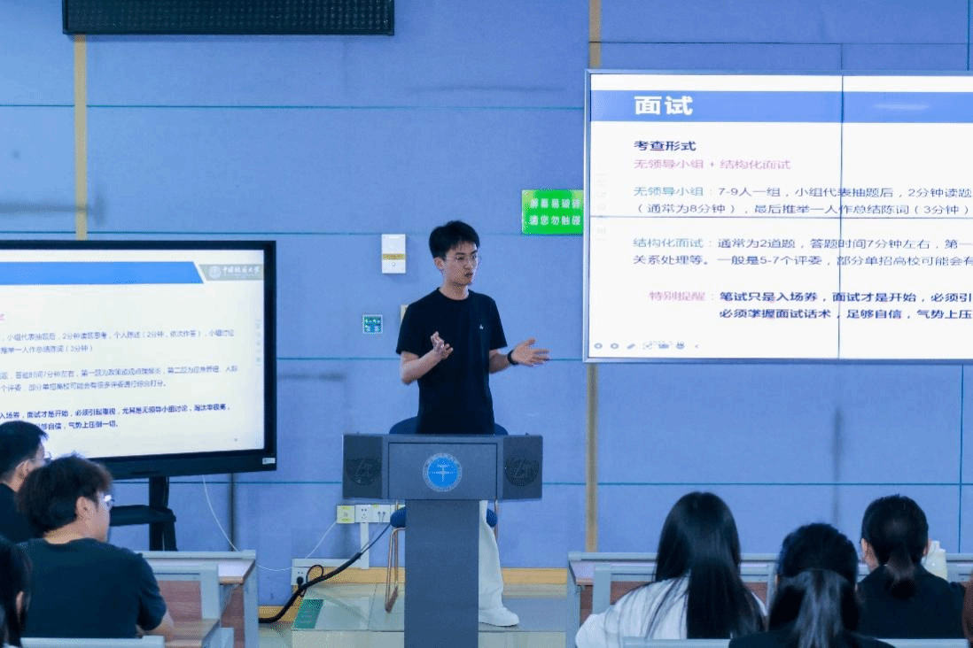 已被航天三江党务管理岗录取的胡伟民,凭借丰富的国企笔试、面试经验,为同学们拨开求职迷雾。他分享了国企求职的注意事项、独家备考秘籍与常用的国企招聘信息发布网站,鼓励同学们坚定信念,勇敢追求理想职业。
