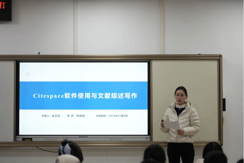 陈吕磊围绕“CiteSpace是什么”“CiteSpace如何为我们所用”“文献拆解阅读”以及“经验分享”四个部分展开分享。她首先介绍,CiteSpace是一款用于可视化和分析科学文献网络的工具,能帮助研究者洞察学术领域的知识结构与演进脉络,通过将大量文献数据转化为可视化图形,实现“一图谱春秋,一览无余;一图胜万言,一目了然”的效果,使复杂文献关系清晰呈现。