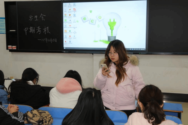 考核环节由各部门负责人按照办公室、组织部、学术部、青马力行志愿服务团队、文体部、权益服务部、全媒体中心、项目部的顺序,依次进行工作述职答辩。各位负责人围绕本学期工作成果、亮点创新、问题反思以及未来规划等方面进行了详细汇报,并接受主席团的现场提问与点评。