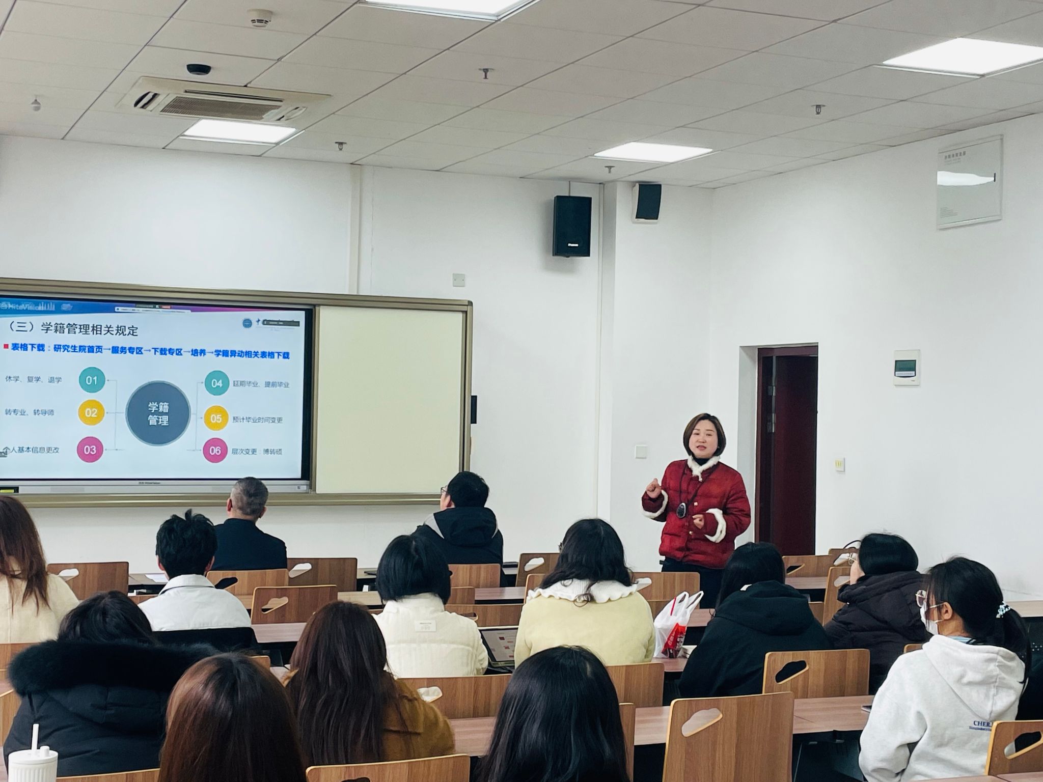 钱源对低年级研究生的培养方案、课程安排、学位要求等内容进行了系统讲解。她重点针对研三学生的毕业要求进行了详细解读,系统讲解了学位论文撰写规范、答辩流程以及毕业资格审查的具体标准,提醒研三同学高度重视毕业论文进度,严格按照时间节点完成各项任务,确保顺利毕业。