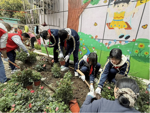 在社区绿植栽种实践环节,马院学子与社区工作人员一同规划栽种区域、合理分配劳动工具,带领中学生和家长分工协作,有序开展挖坑、扶苗、填土、压实等栽种工作。过程中,紧扣劳动教育理念,向中学生讲解劳动最光荣、最崇高的内涵,引导大家在亲手栽种中体会共建美好社区的乐趣;鼓励中学生相互配合、互帮互助,在团队协作中培育奉献精神与集体意识。栽种完成后,带领中学生整理现场劳动工具、清理栽种区域垃圾,引导其养成文明劳动、爱护环境的良好习惯,让劳动实践成为涵养品格、践行担当的重要载体。