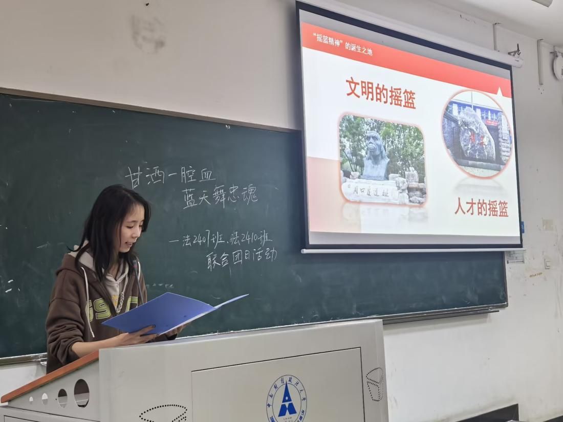 2024年11月14日16点20分,williamhill威廉希尔第十五期红色之声“摇篮筑梦”团队在线下进行了主题为“生命安全主题教育”、“甘洒一腔血,蓝天舞忠魂”和“传摇篮精神,做时代新人”的线下宣讲,团队成员郭雅婕、李瑞雪、席海冰、辛汪洋、朱一婷担任主讲人,中南财经政法大学法学院2407和2410团支部参与本次活动,共计116名同学。