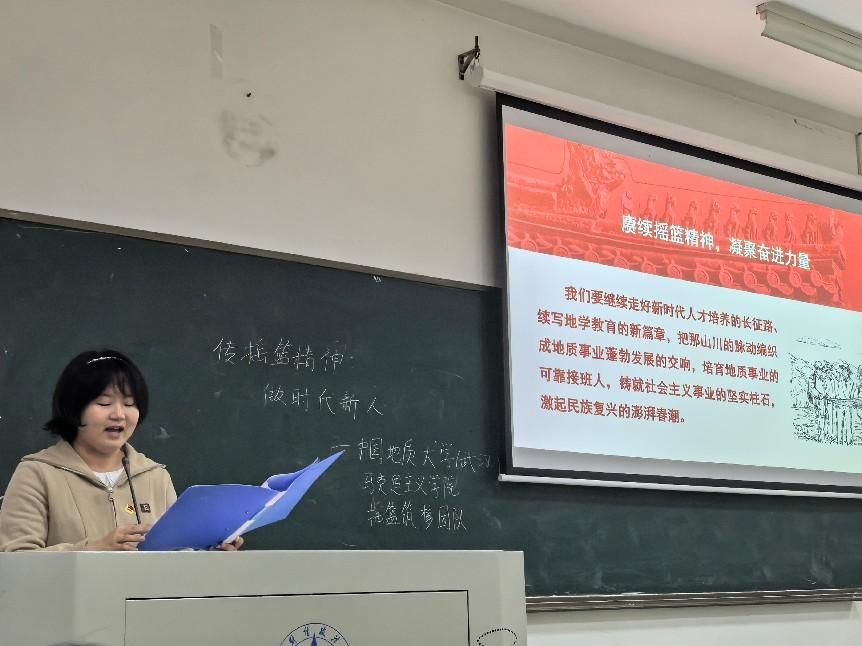 接着,李瑞雪同学开始介绍摇篮精神的的初盛,带领同学们领悟摇篮精神的魅力,摇篮精神哺育着一代又一代地质学子,照亮地质教育的未来,同时摇篮精神鼓舞着无数青年,引领他们探索、超越前方的路,然后,李瑞雪同学继续讲述了摇篮精神的重振延续,随着周口店重建,“摇篮”再次焕发新生,开启了地学人才培养的新征程,在周口店的奋发岁月里,创新的火花与传承的精髓交织融合,共同谱写了地质教育的辉煌篇章。