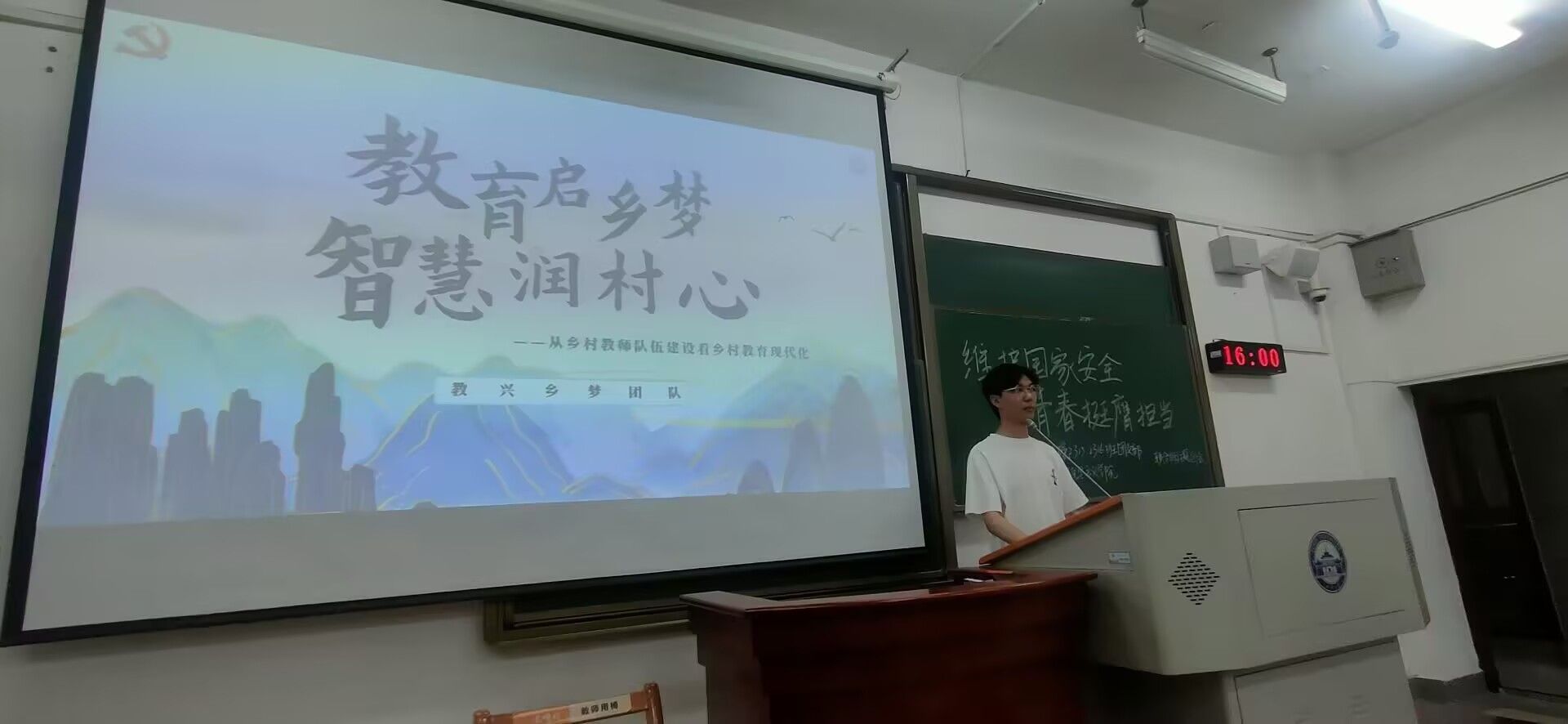 首先,教兴乡梦团队成员朱原雨同学展开了主题为“教育启乡梦,智慧润村心”的红色之声宣讲。朱原雨向在场同学们阐述了乡村教育现代化的内涵与面临的困境,使同学们对乡村教育的现状有了更深入的认识和了解。