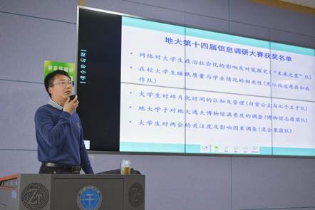 首先,李海金老师以“第十四届信息调研大赛”获奖队伍为切入点,引出“何为社会调查”的问题。他表示,完整的社会调查需要以“明确调查主题、确定调查内容、实施调查过程、得出调查结论”四个步骤为基础。接着,李海金老师从“选择研究问题”入手,系统介绍定量研究与定向研究两大“研究设计方向”,最终落脚“得出研究结果”,帮助同学们构建“如何设计调查方案”完整逻辑框架。谈到社会调查的研究方法时,他选取统计调查、实验研究、实地研究、文献研究四种代表性方法详细阐释,并强调:“不同的方法适合不同的情境,方法的选择要以实际情况为准。”此后,针对撰写调查报告的注意事项,李海金老师用“内容逻辑清晰,结构合理平衡”进行概括,并结合具体事例进行分析。