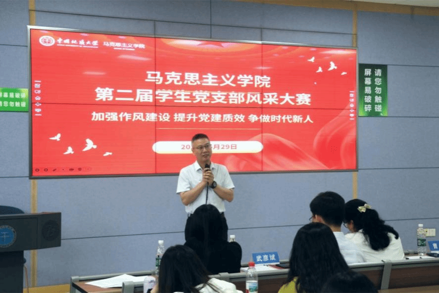 在支部建设风采展示环节,各学生党支部代表依次上台进行汇报,汇报围绕组织建设、理论学习、活动开展、特色亮点、成效经验等主题,详细介绍了过去一年的支部的成果与经验。青马明志党支部秉持“青年有为,以史明志”建设理念,形成了“党建引领+理论研究+服务创新”的工作模式。青马明德党支部从“创新理论学习新形势、探索支部互学新模式、寻求结对领航新方式”三方面进行支部介绍。青马筑梦党支部坚持“一个核心、两大关注、三重着力、四维协同”工作思路筑牢支部建设堡垒。青马明责党支部围绕支部概况、支部建设、工作不足与未来展望四方面详实介绍支部建设情况。青马明理党支部分享了党支部项目结题、组织生活与活动纪实、特色亮点工作以及经验成效。