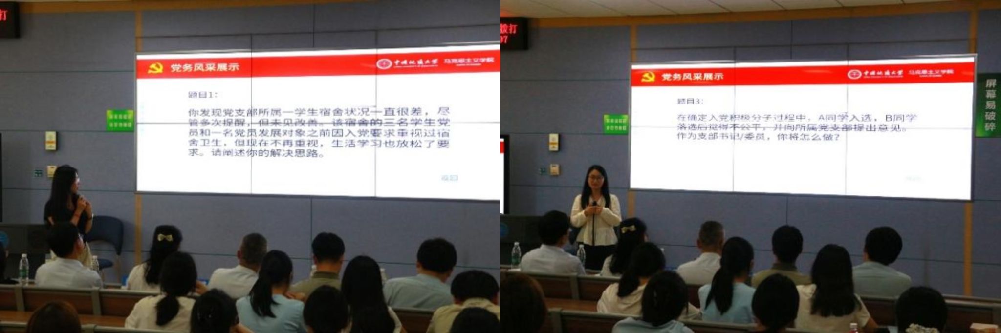 在党务风采展示环节,各支部派代进行抽提作答,题目涵盖如何强化党支部作风建设、提升支部主题党日活动效果、发挥党员先锋模范作用、利用人工智能技术开展组织生活等。考察题目既贴近党员学习和生活,又聚焦党建工作实际,为检验党员党务知识和能力,强化广大党员同学的责任意识,进一步提升其党性修养提供了帮助。