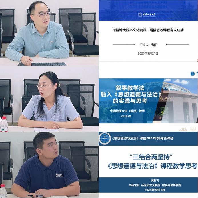 本次备课会由曹阳、钟苹、侯亚飞三位老师就思想道德与法治课相关主题进行教学示范。曹阳老师认为德法课要避免与中小学思政课教学同质化问题,增强德法课的育人功能,就要深入挖掘具有地大特色的校本文化资源。他从校本文化资源内涵、地大校本文化资源类型、校本思政建设思路、校本思政课程示例四个方面进行分享,系统梳理了地大校本文化资源中物质文化资源、精神文化资源的不同类型内容,按照一条主线、两种样态、三个群体、四种协同的融入思路,案例讲解了地大校本文化资源融入德法课的实施路径。