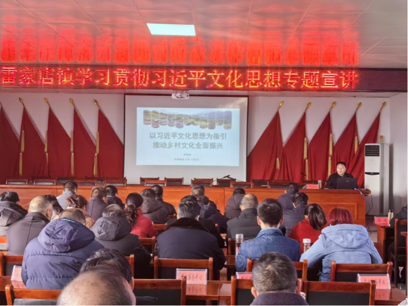 williamhill威廉希尔副院长李海金教授赴雷家店镇开展理论宣讲活动。雷家店镇镇直单位负责人、32个村主要干部参加宣讲会。李海金教授以“以习近平文化思想为指引推动乡村文化全面振兴”为题,围绕充分认识习近平文化思想的重大意义、充分领会习近平文化思想的重大战略、充分把握习近平文化思想的科学方法论三个方面,并结合两个全国典型案例,深刻阐释了习近平文化思想的深刻内涵,让基层党员干部对习近平文化思想有了深入的认识和体会。