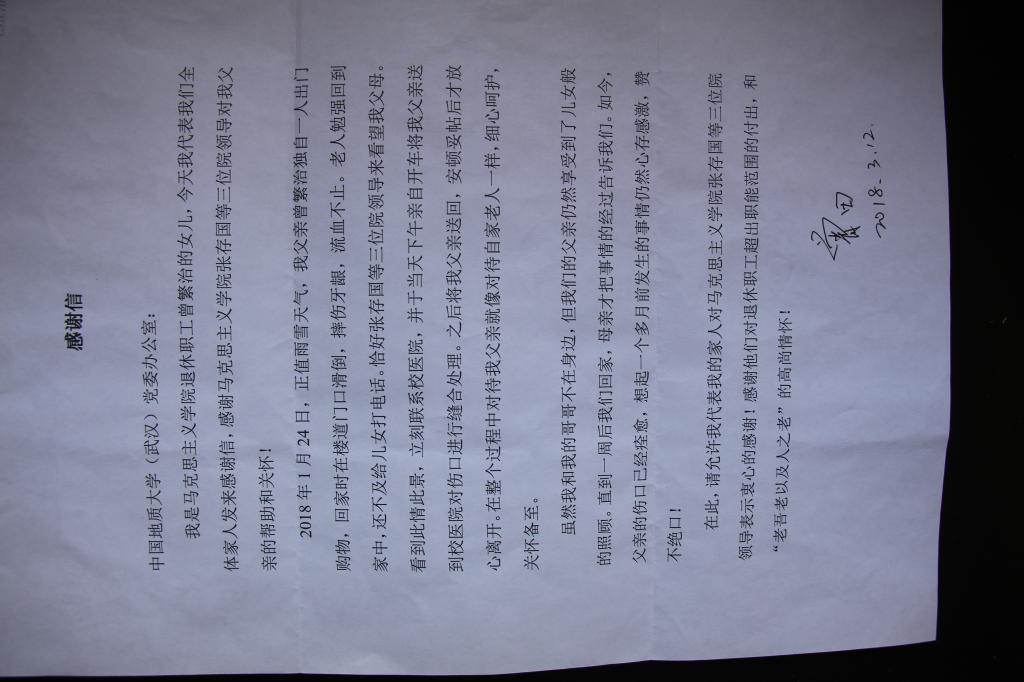 信是由我院退休职工曾繁治的女儿曾田写的。信里对我院张存国、阮一帆、严世雄等同志在2018年寒假看望离退休职工途中,遇到其父亲摔伤后立即送往医院救治表示了感谢!对学院关爱离退休教职工表示感谢!
