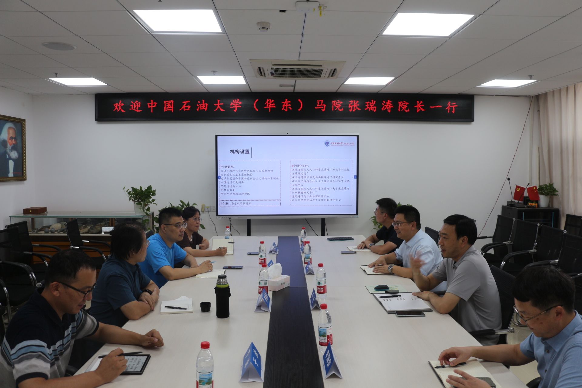 阮一帆院长对张瑞涛院长一行来校表示欢迎,重点介绍了我院的发展历程、机构设置、师资队伍、思政课建设、学院发展思路、省级重点马院建设和人才培养等特色经验。石油大学张瑞涛院长一行也分别介绍了马院的发展思路以及学科特色上的探索经验。