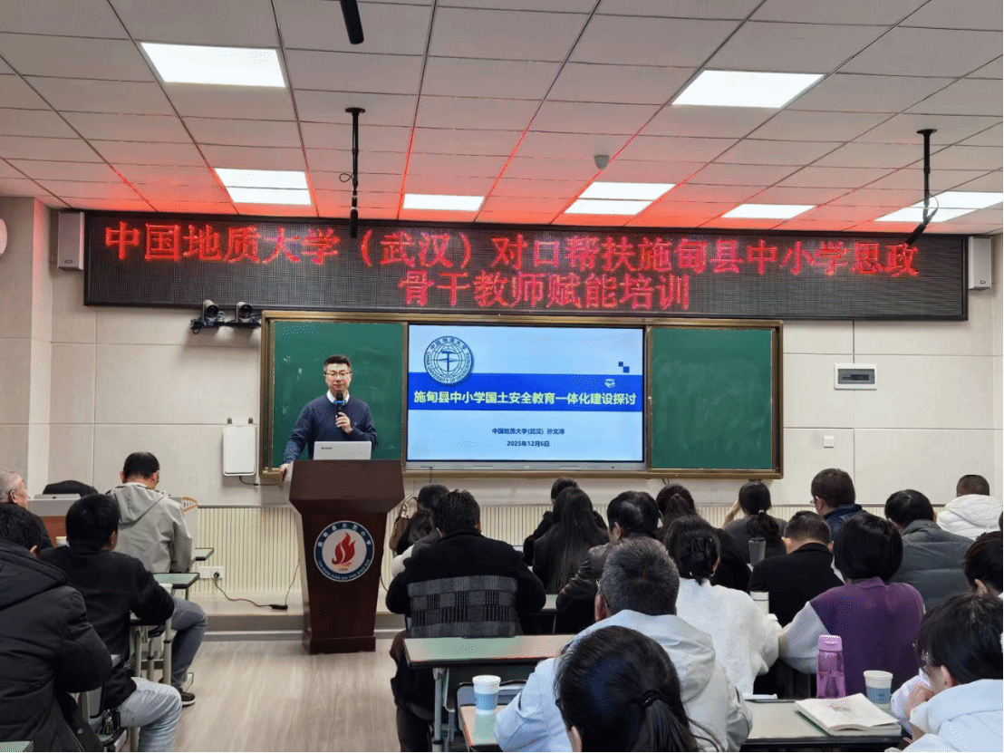 学院孙文沛副院长解读了习近平总体国家安全观的深刻内涵和实践成就,分享了地大创建《国土安全》品牌思政课的实践经验,分析了施甸县中小学国土安全教育一体化建设的内容和路径,助力当地教师打开校本课程建设的新视野。